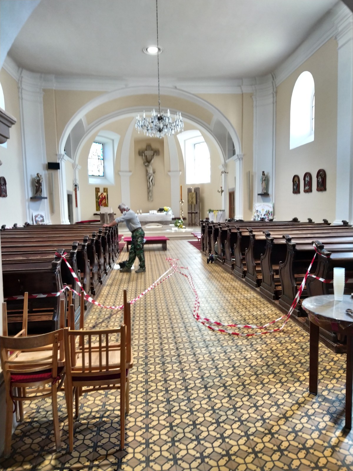 Období karantény se dá využít všelijak. Třeba k natírání podlah v kostelních lavicích. Jindy, než teď, by to asi určitě snad možná nikdy nebylo možné... Díky obětavému týmu dobrovolných natěračů a natěraček!