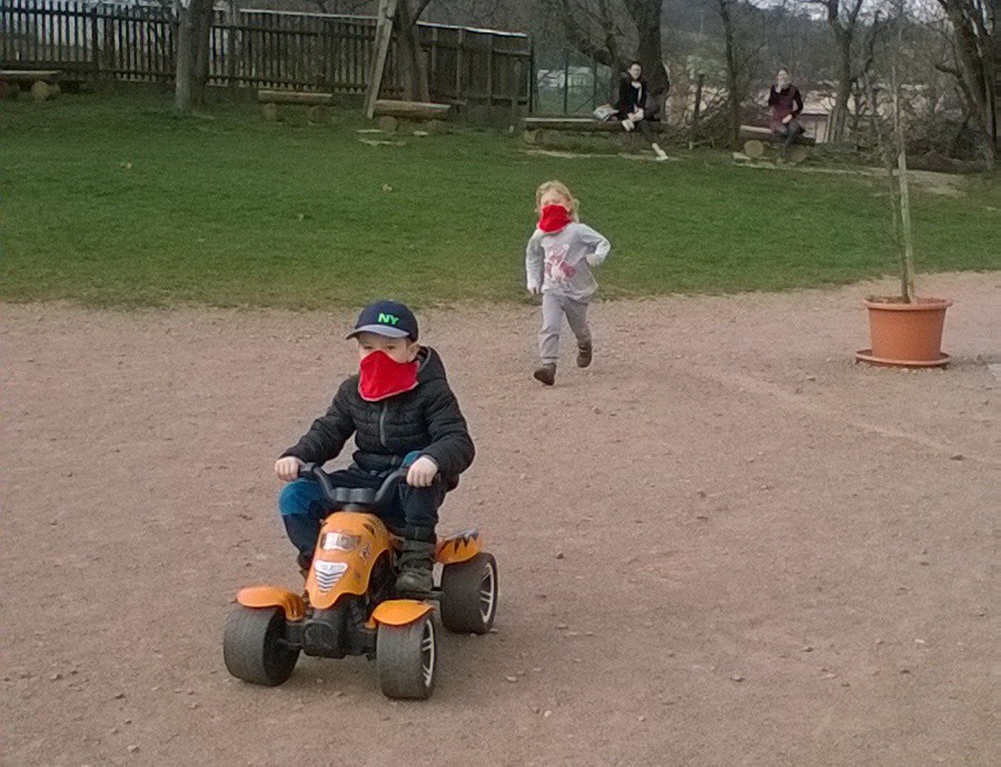 Svátek svatého Josefa byl velmi inspirativní. Napadlo nás ušít roušky speciálně malým dětem z bavlněných triček (dostali jsme nové z reklamní akce). Fotky jsou z kostýmové a zátežové zkoušky :) Výhodu mají v tom, že se děti snadněji vysmrkají, napijí a roušky se dají navíc v nouzi jen pootočit, když navlhnou.