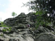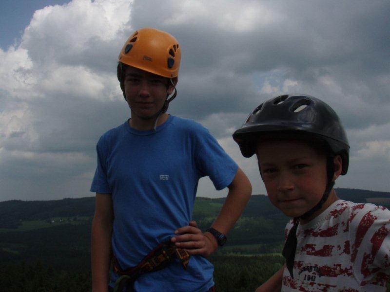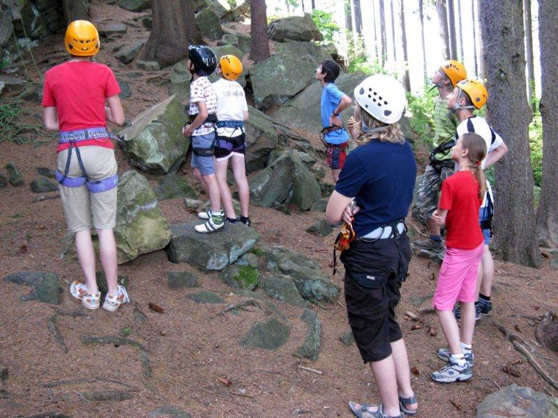 V sobotu 12. června jsme vyrazili do okolí Nového Města na Moravě. Instruktor Adam nám rozdal přilby, sedáky a lana, naučil nás správně navazovat na lano a seznámil nás se slaňovací brzdou. Na malé skalce jsme si vyzkoušeli slaňování a brzy jsme začali zdolávat první metry směrem vzhůru. Po této přípravě jsme vyrazili na 30 metrů vysokou Drátenickou skálu. Výstup byl náročný, ale díky bezpečnému jištění též úspěšný. Rozhled z vrcholu stál za tu únavu: zelené lesy, zvlněné louky, malá políčka, hnědé skály a stříbrné rybníky. A to nás ještě čekalo adrenalinové slanění do převisu! Protože stále svítilo sluníčko vykoupali jsme se na závěr v Milovském rybníce a málem chytili i jednoho kapra! Domů jsme přijeli bohatší o spoustu zážitků (a včas před večerní bouří.)